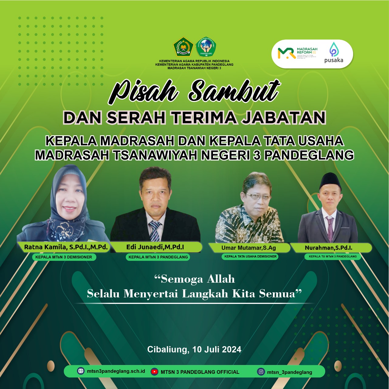 Setiap pertemuan pasti ada perpisahan, mutasi dan rotasi adalah hal yang biasa bagi seorang ASN di sebuah institusi. Hal ini pun terjadi di MTsN 3 Pandeglang, ibu Ratna Kamila, S.Pd.I, M.Pd digantikan oleh pak Edi Junaedi, M.Pd.I sebagai Kepala Madrasah di MTsN 3 Pandeglang. Selain itu, Pak Umar Mutamar, S.Ag selaku Kepala Urusan Tata Usaha MTsN 3 Pandeglang digantikan oleh pak Nurahman, S.Pd.I yang awalnya sebagai Ka TU di MTsN 6 Pandeglang. Ibu Ratna kamila bertugas di MTsN 4 Pandeglang dan Bapak Umar Mutamar mutasi menjadi Ka TU di MTsN 1 Pandeglang